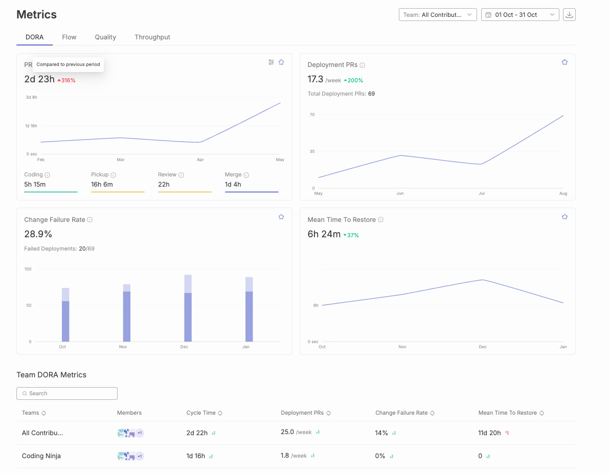 Typo has a metrics dashboard that focuses on the team’s health and performance. It lets engineering leaders compare the team’s results with what healthy benchmarks across industries look like and drive impactful initiatives for your team. Since it considers only the team’s goals, it lets team members work together and solve problems together. Hence, fosters a healthier and more productive work environment conducive to innovation and growth.